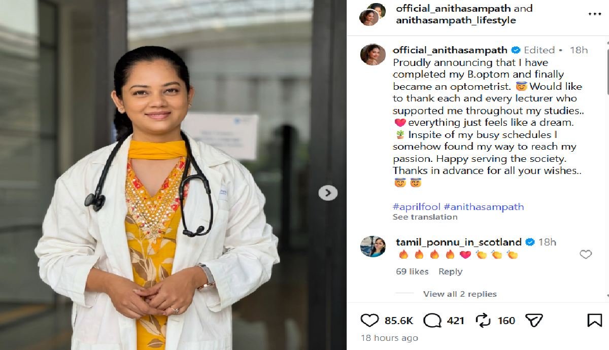 அனிதா சம்பத் தொடர்ந்து அவருக்கு வீடும், அவர் அம்மாவுக்கு ஒரு சொந்த வீடு வாங்கி பலரை ஆச்சரியப்படுத்தி இருந்தார். இந்நிலையில் தொடர்ந்து அனிதா சம்பத் தற்போது வெளியிட்டு இருக்கும் பதிவில், தான் பி ஆப்டம் படிப்பை முடித்து இருக்கிறார்.