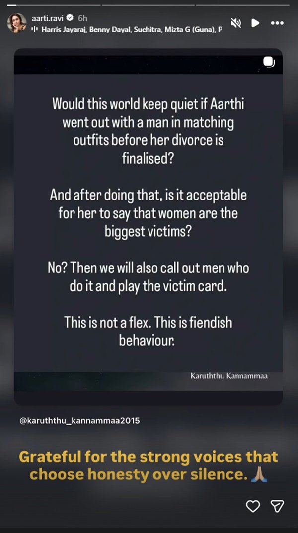 இந்நிலையில் ஆர்த்தி இன்ஸ்டாவில் ஒருவர் போட்ட போஸ்ட்டை தன் ஸ்டோரியாக போட்டு, நேர்மைக்காக குரல் கொடுப்பவர்களுக்கு நன்றி என்று கூறியுள்ளார். அவ்ர் ஷேர் செய்துள்ள அந்த ஸ்டோரியில்