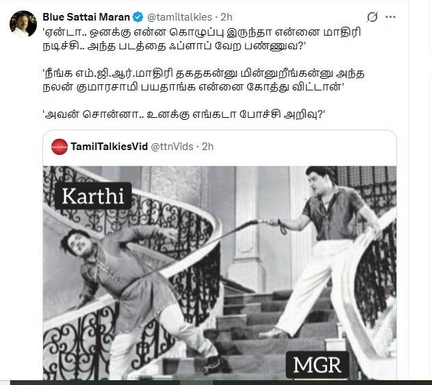 இந்த நிலையில் திரைவிமர்சகர் புளூசட்டை மாறன் வா வாத்தியாரே படத்தை கலாய்த்து ஒரு பதிவை வெளியிட்டிருக்கிறார். நலன் சொன்னா உனக்கு எங்கடா போச்சி அறிவு என கார்த்தியை எம்ஜிஆர் மிரட்டுவது போல ஒரு மீம்ஸை வெளியிட்டிருக்கிறார்.
