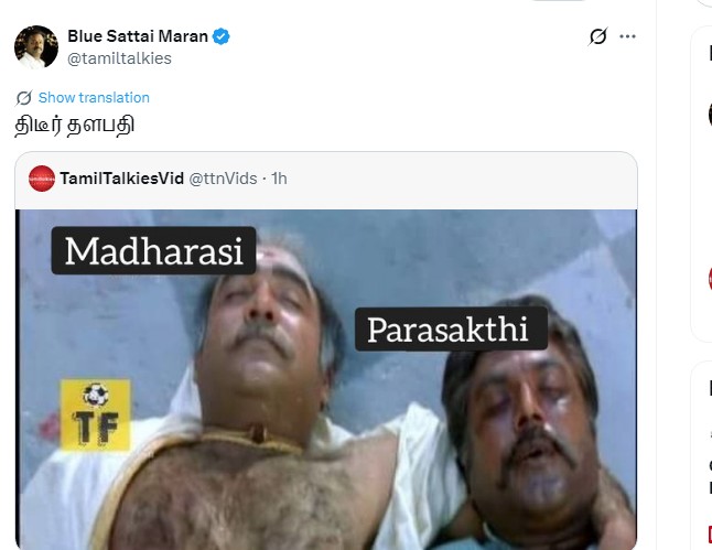 ஒருபக்கம் சிவகார்த்திகேயனை தொடர்ந்து கடுமையாக விமர்சித்து வரும் பிரபல சினிமா விமர்சகர் புளூசட்ட மாறன் மதராஸி மற்றும் பராசக்தி இரண்டு படமும் காலி என ஒரு மீம்ஸ் போட்டு கலாய்த்திருக்கிறார். பராசக்தி தொடர்பாக ஏற்கனவே இவர் வெளியிட்ட விமர்சன வீடியோவிலும் இந்த படத்தை பங்கம் செய்திருந்தார்.