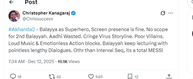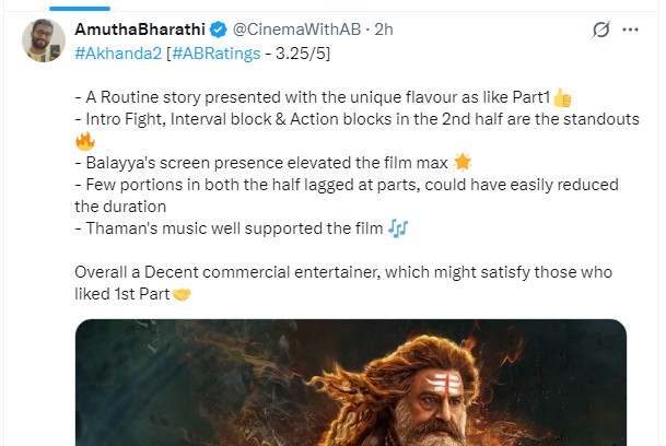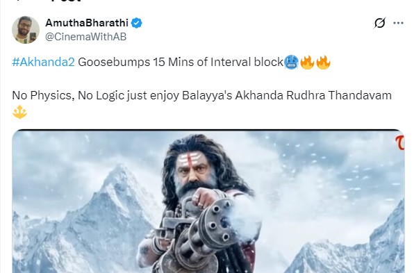 இடைவேளை காட்சி கூஸ்பம்ப்ஸாக இருக்கிறது. நோ பிசிக்ஸ்.. நோ லாஜிக்.. ஆனால் பாலையாவின் அகாண்டா 2 ருத்ர தாண்டவம்’ என ஒருவர் பதிவிட்டுள்ளார்.