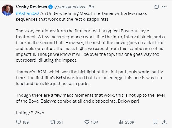 போயப்பட்டு ஸ்ரீனு – பாலையா கூட்டணியில் இன்னும் நிறைய எதிர்பார்த்தேன். ஆனால் அப்படி எதுவும் படத்தில் இல்லை. அகாண்டா முதல் பாகத்தில் தமனின் பின்னனி இசை சிறப்பாக இருந்தது. ஆனால் அகண்டா 2 வில் நிறைய இடங்களில் தமனின் பின்னணி இசை ஒரே சத்தமாக இருக்கிறது.