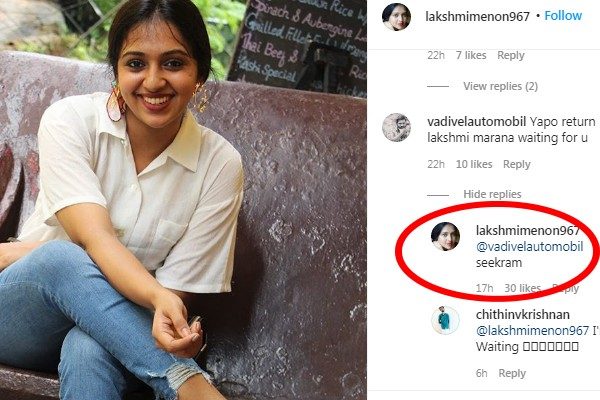 எஸ்.ஆர்.பிரபாகரன் இயக்கத்தில் சுந்தரபாண்டியன் படத்தின் மூலமாக சினிமாவில் அறிமுகம் ஆன லட்சுமி மேனன் அதன் பிறகு கும்கி, ஜிகர்தண்டா, வேதாளம் என அதிகம் பேசப்பட்ட படங்களில் நடித்து பிரபலமானார். கேரளத்து வரவான நடிகை லட்சுமி மேனனுக்கு தமிழில் ஏகப்பட்ட ரசிகர்கள் உருவாகினர்.