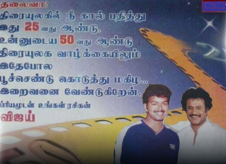 ரஜினி சினிமாவிற்கு வந்து 25 ஆண்டுகள் ஆனபோது அது தொடர்பாக வாழ்த்து செய்தியை வெளியிட்ட விஜய் ‘தலைவா திரையுலகில் நீ கால் பதித்து இது 25 ஆவது ஆண்டு.. உன்னுடைய 50வது ஆண்டு திரையுலக வாழ்க்கையிலும் இதேபோல பூச்செண்டு கொடுத்து மகிழ இறைவனை வேண்டுகிறேன்.. பிரியமுடன் உங்கள் ரசிகன் விஜய்’ என வாழ்த்து சொல்லியிருந்தார். அந்த போஸ்டரை இப்போது பலரும் பகிர்ந்து ‘சொன்னது என்னாச்சு விஜய்? ரஜினிக்கு இதுவரை நீங்கள் வாழ்த்து சொல்லலையே’ என கேள்வி எழுப்பி வருகிறார்கள்.