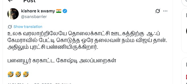 அந்த பேட்டியில் விஜய் என்ன பேசினார் என்பது இன்று காலை முதலே பல ஊடகங்களும் செய்தி வெளியிட்டன. இந்நிலையில் ‘கேமராவை ஆஃப் பண்ணிட்டு பேட்டி கொடுத்த முதல் அரசியல்வாதி விஜய்தான்.. அது வீடியோவா பேச கூட அவருக்கு தைரியம் இல்லை.. இவர் அரசியலுக்கு வந்து என்ன செய்யப் போறார்?’ என்று பலரும் அவரை ட்ரோல் செய்து வருகிறார்கள். குறிப்பாக திமுக, அதிமுக ஆதரவாளர்கள் விஜயை நக்கலடித்து வருகிறார்கள்..