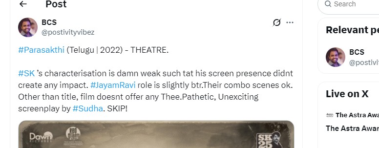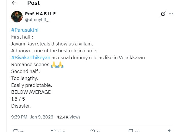 படத்தில் வரும் காமெடி காட்சிகள் வொர்க் அவுட் ஆகவில்லை.. படத்தில் வரும் எமோஷனல் காட்சிகள் ரசிகர்களிடம் எந்த பாதிப்பையும் ஏற்படுத்தவில்லை.. மொத்தமாக சொன்னால் பராசக்தி எதிர்பார்த்த அளவுக்கு இல்லை.. நல்ல கன்டென்ட் ஆனால் சொல்லிய விதம் சரியில்லை’ என ஒருவர் பதிவிட்டிருக்கிறார்.