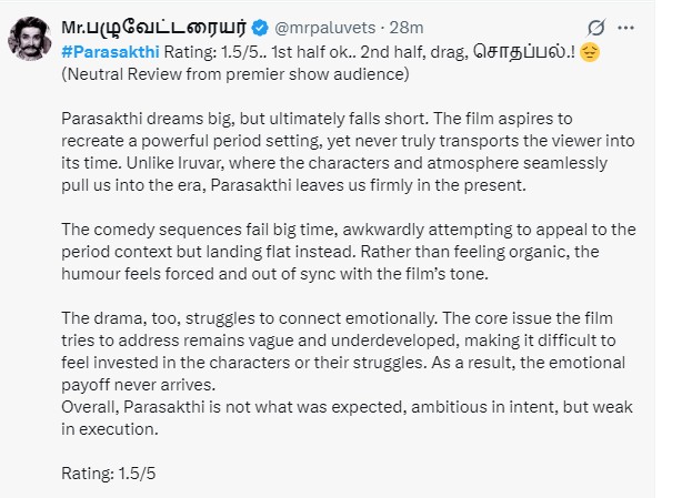 பராசக்தி பெரிதாக எதிர்பார்க்கப்பட்டது.. ஆனால் அப்படி படத்தில் ஒன்றுமில்லை.. 1960 காலகட்டத்திற்கு ரசிகர்களை கொண்டு செல்ல முயற்சி செய்திருக்கிறார்கள். ஆனால் அது ஒர்க்அவுட் ஆகவில்லை.. அதனால் ரசிகர்கள் நிகழ்காலத்திலேயே இருக்கிறார்கள்.. அதுவே படத்திற்கு பெரிய மைனஸ்.