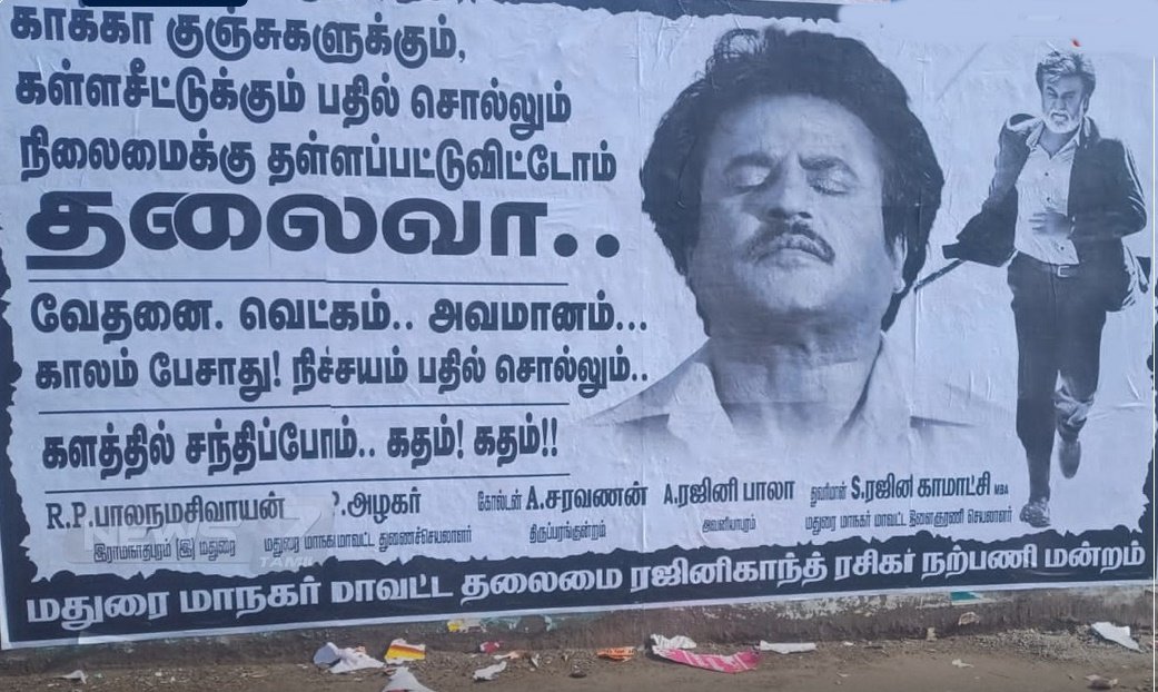 இந்த நிலையில் மதுரையில் ரஜினி ரசிகர்கள் ஒட்டிய் போஸ்ட்ரால் பரபரப்பு ஏற்பட்டுள்ளது அந்த போஸ்டரில் காக்கா குஞ்சுகளுக்கும், கள்ள சீட்டுகளுக்கும் பதில் சொல்லும் நிலைக்கு தள்ளபட்டுவிட்டோமே தலைவா… வேதனை வெட்கம் அவமானம் காலம் பேசாது! நிச்சயம் பதில் சொல்லும்!! கலத்தில் சந்திப்போம் கதம் கதம் என்ரு வாசகம் அடங்கிய போஸ்டர் மதுரை நாக்ர் முழுவதும் ஒட்டப்பட்டுள்ளது.