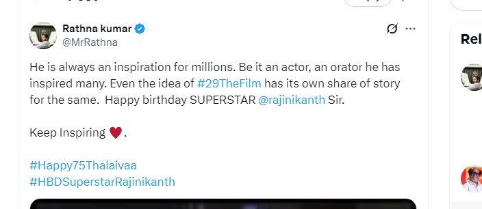 இந்நிலையில்தான், மேயாத மான், ஆடை, குளு குளு ஆகிய படங்களை இயக்கிய ரத்னகுமார் ரஜினி பல வருடங்களுக்கு முன்பு ரமண மகரிஷி பற்றி பேசிய வீடியோவை வெளியிட்டு வாழ்த்து சொல்லியிருக்கிறார். ரத்னகுமார் அடிப்படையில் ஒரு விஜய் ரசிகர். லோகேஷ் கனகராஜின் நெருங்கிய நண்பர் இவர்., லோகேஷ் விஜய்யை மாஸ்டர், லியோ ஆகிய படங்களை இயக்கிய போது அந்த படத்தில் ரத்னகுமாரும் வேலை செய்தார்.