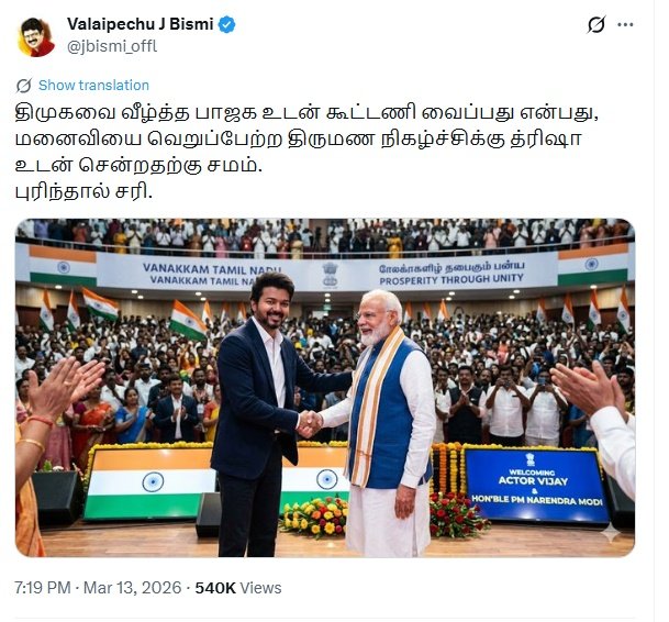 இந்த நிலையில் பிரபல பத்திரிக்கையாளர் வலைபேச்சு பிஸ்மி இதுகுறித்து தனது எக்ஸ் பக்கத்தில் கருத்தினை தெரிவித்துள்ளார். அதில், திமுவை வீழ்த்த பாஜகவுடன் கூட்டணி வைப்பது மனைவியை வெறுப்பேற்ற திருமண நிகழ்ச்சிக்கு திரிஷாவை அழைத்து சென்றததற்கு சமம் புரிந்தால் சரி என்று கூறியுள்ளார்.